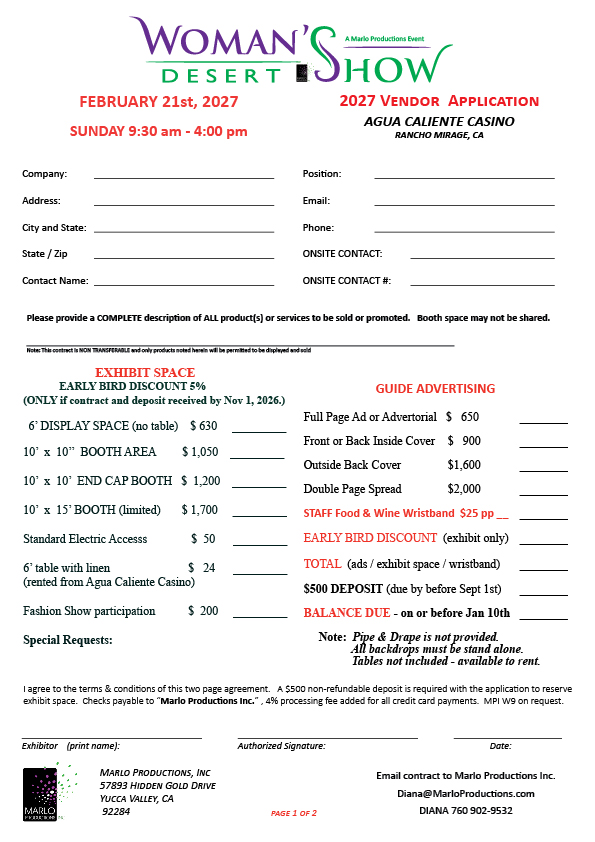 Contact us at 760 902-9532  or diana@marloproductions.com with any questions regarding the vendor application.