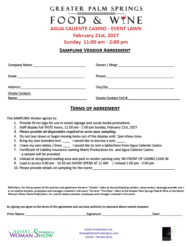 Contact Diana Marlo at 760 902-9532  or diana@marloproductions.com with any questions regarding the vendor application.